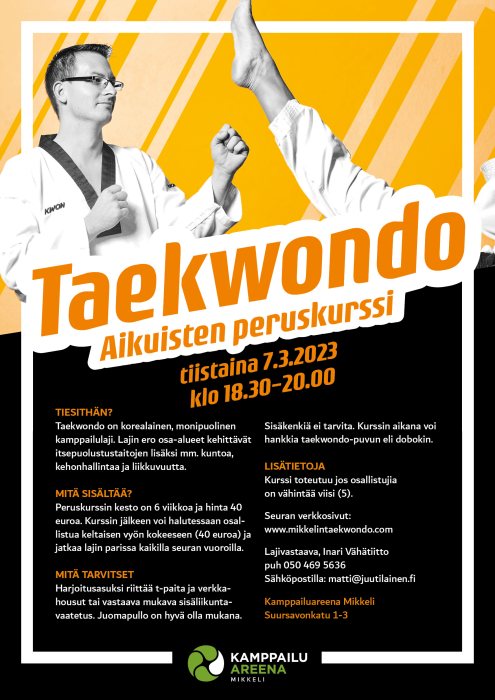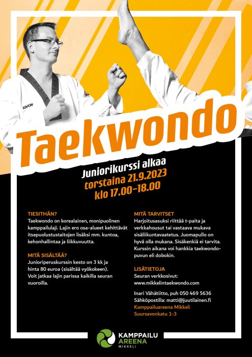 Taekwondon peruskurssi alkaa jälleen. Tervetuloa kaikille sopivan, vauhdikkaan lajin pariin! Peruskurssin alaikäraja on 14-vuotta.