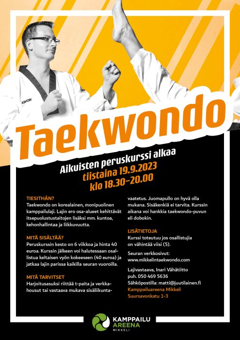 Taekwondon aikuisten peruskurssin harjoitukset jatkuvat 26.9. klo 18:30-20:00.